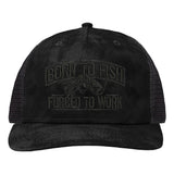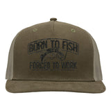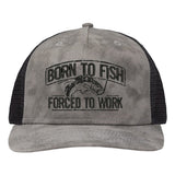This adjustable, high-quality trucker hat features the "Born to Fish, Forced to Work" logo embroidered on it. It blends humor with practicality, making it an excellent accessory for fishing trips, outdoor activities, or casual wear. Crafted from brushed cotton canvas, it includes a breathable mesh back panel for ventilation slight-curved bill and black undervisor. The structured front panel provides a classic trucker hat silhouette. The mesh back promotes airflow, making it ideal for outdoor use. Stitching details on the brim enhance its rugged and functional appearance.