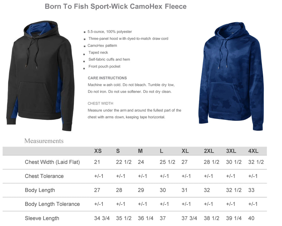 This Microfiber Performance Hooded Sweatshirt is the ultimate choice for fishing enthusiasts who value comfort, durability, and functionality. Made from middleweight, breathable microfiber fabric, this performance sweatshirt keeps you cool and dry, even during the hottest days on the water. Sport-Wick moisture-wicking technology helps keep you cool. Anti-static pullover has full CamoHex pattern, featuring the signature "Born To Fish" logo on the left chest. A must-have for any angler who wants to fish in style and comfort!