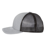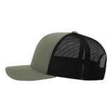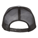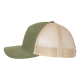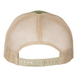 The structured front panel provides a classic trucker hat silhouette. The mesh back promotes airflow, making it ideal for outdoor use. Stitching details on the brim enhance its rugged and functional appearance.