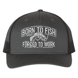 This adjustable, high-quality trucker hat features the "Born to Fish, Forced to Work" logo embroidered on it. It blends humor with practicality, making it an excellent accessory for fishing trips, outdoor activities, or casual wear. Crafted from a mix of polyester and cotton, it includes a breathable mesh back panel for ventilation.